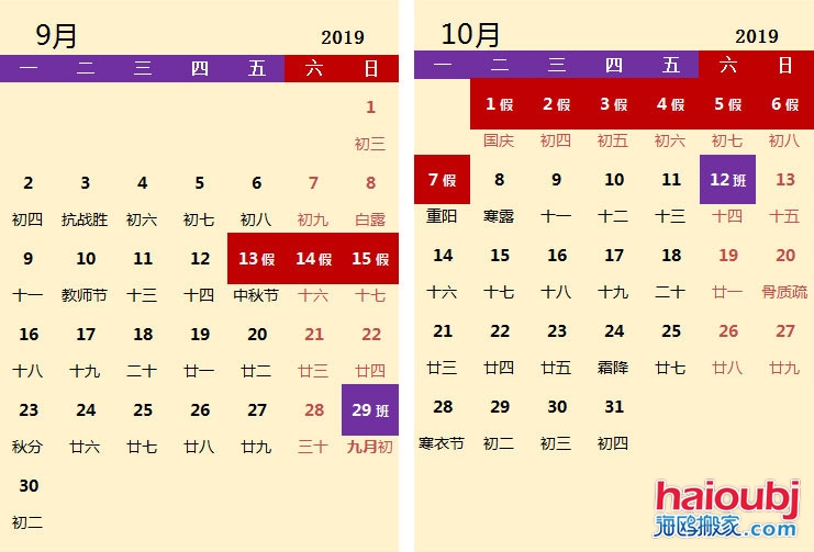 比較復(fù)雜的假期,國(guó)慶節(jié)放假時(shí)間是10月1日到10月7日,共計(jì)7天。需要調(diào)休的時(shí)間是節(jié)前的周日(9月29日),節(jié)后的周六(10月12日),節(jié)后連續(xù)工作6天,傷不起!另外,國(guó)慶節(jié)剛好是新中國(guó)成立70周年,應(yīng)該會(huì)有大閱兵。